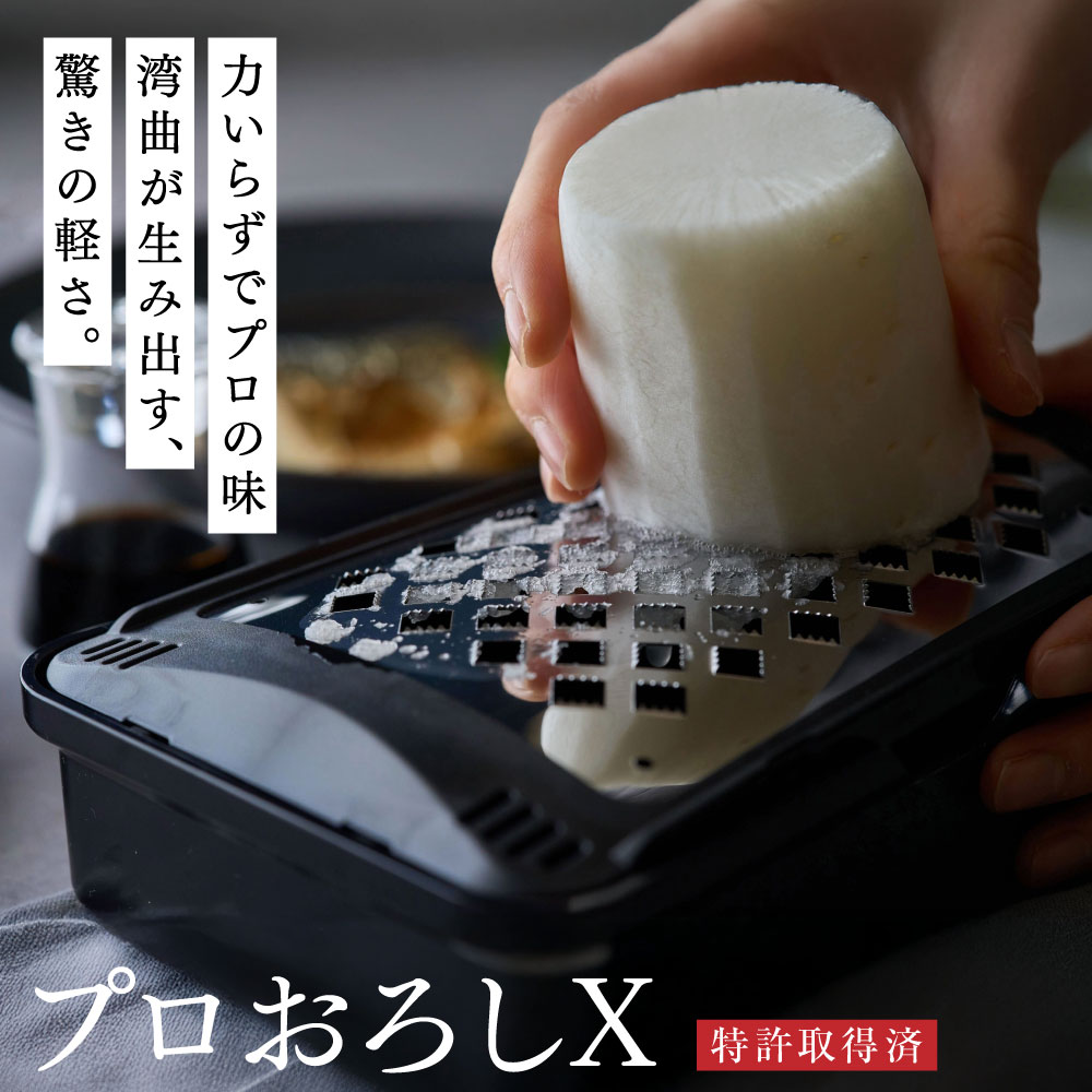 力加減とおろす角度によって「粗さ」を変えることができるおろし器。食材の接地面を少なくすることで、軽い力で楽に食材がおろせるように、計算され作られた商品です。 大根やにんじんはもちろん、山芋、しょうが、トマト、チーズ、フランスパンまで、色んな食材を手早く、たっぷりおろせます。