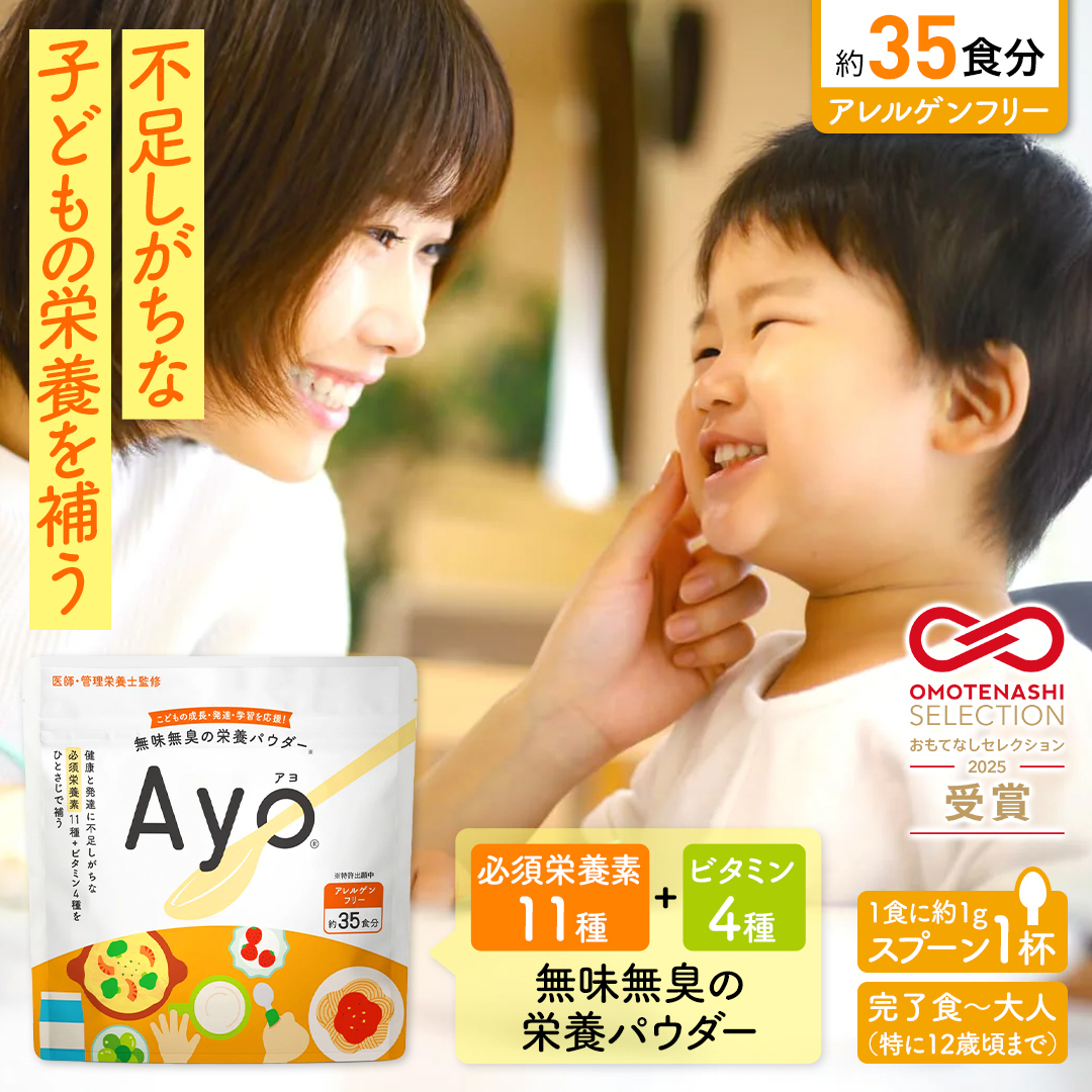 無味無臭の栄養パウダー。必須栄養素11種+ビタミン4種アレルゲンフリーです。スプーン1杯・約1gを食事や飲み物に混ぜるだけ!簡単・手軽に不足しがちな子供の栄養を補うことができます。〈お召し上がり方〉1日1~3g(付属スプーン1~3杯)を目安に、お好みの料理やおやつ、飲料などに入れ、よくかき混ぜてからお召し上がりください。〈対象年齢〉離乳食完了後のお子さまから大人までご使用いただけます。お子さまだけでなく、ご家族で使用いただけます。